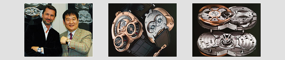 | 時計技術に関するさまざまな情報を交換した後、1億ウォン台のMB&Fの腕時計を着用したスイスMB&F独立時計製作研究所のオーナー兼天才マイスターのマキシミリアン・ブッサー(MAXIMILIAN BUSSER) と大韓民国のチェ・チャンムク時計名匠(トップタイム代表) |