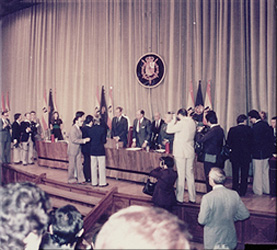 1975年9月20日 スペインのカルロス国王から金メダルを授与されるチェ・チャンムク(写真中央) |