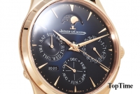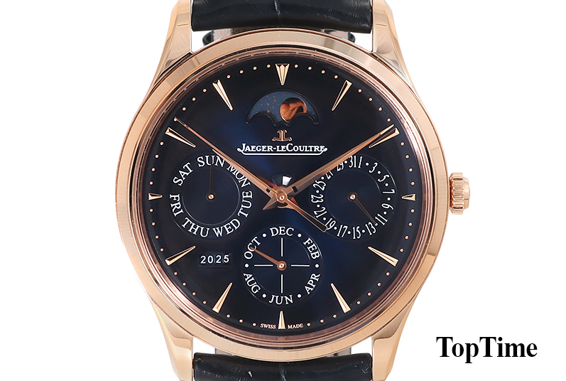 예거 르쿨트르 마스터 울트라 씬 퍼페추얼 캘린더 - 18K Pink Gold, 청판, 문 페이즈, 바 인덱스, 시스루 케이스백, 오토매틱, 가죽밴드, Size: 39mm